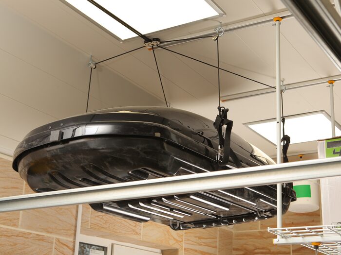 Велосипеды, каяки, лодки и автомобильные боксы могут быть приподняты к потолку, оставляя пространство внизу свободным. Закрепите специальными ремнями и без усилий поднимите самоблокирующимся тросом.